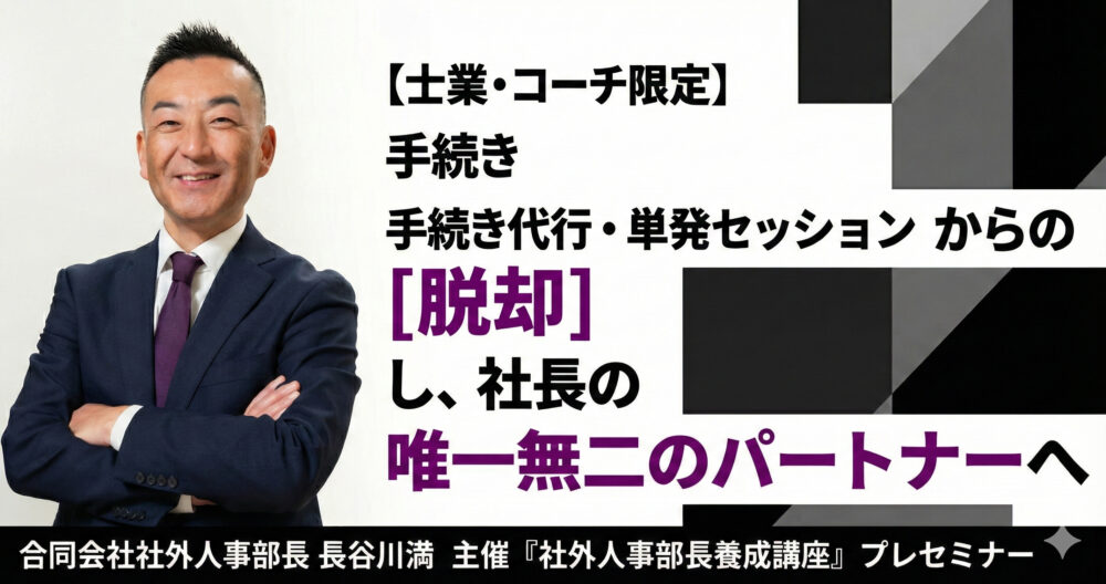 2025年12月 【士業・コーチ限定】手続き代行・単発セッションから脱却し、社長の唯一無二… 2025.12.11 ★社外人事部長 【士業・コーチ限定】手続き代行・単発セッションから脱却し、社… ★社外人事部長 2025.12.11
